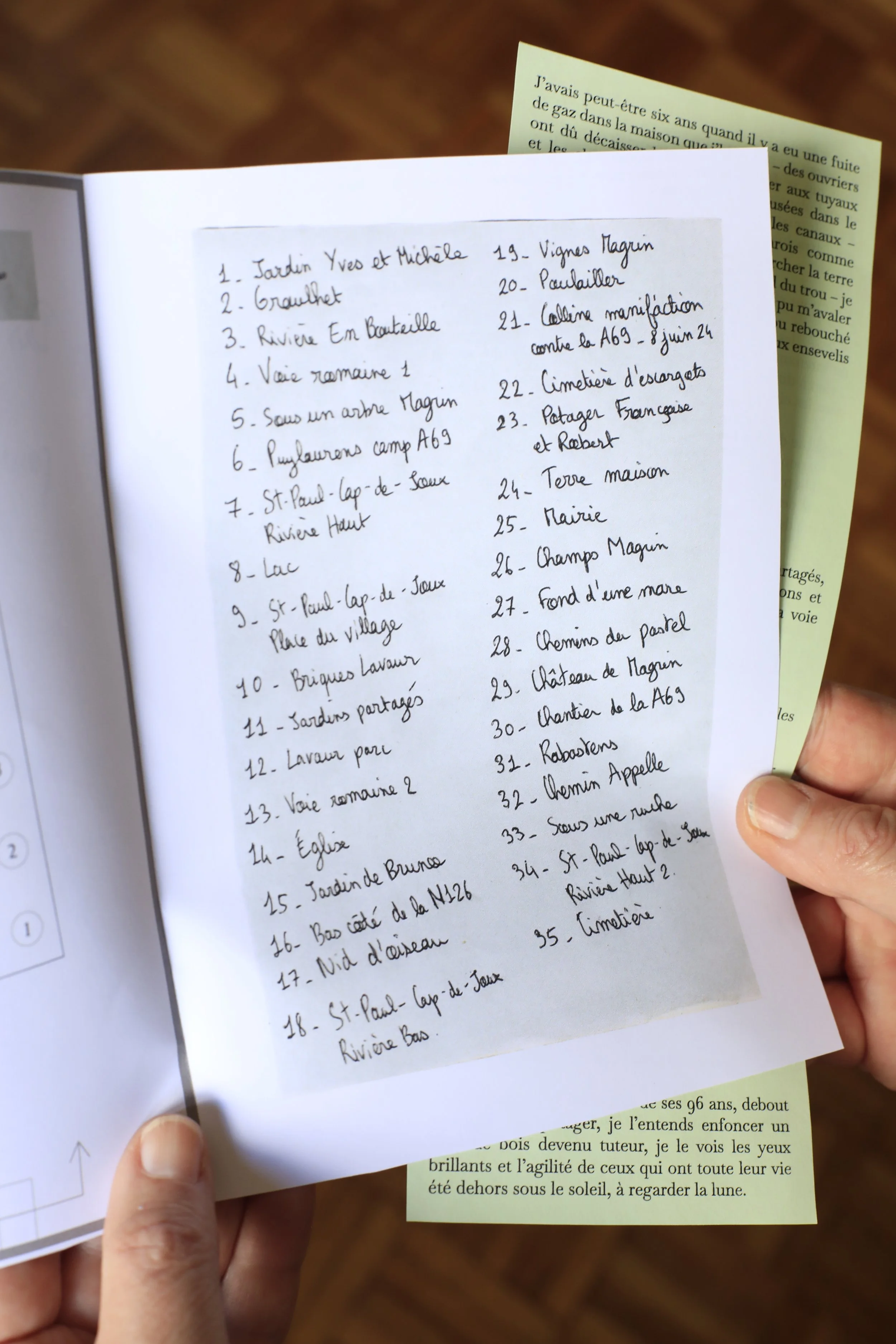 Le blanc de Meudon, la « terre » d’où j’ai grandi, devient le support aux récits Tarnais. Les 35 tas ont été récoltés aux endroits où l’on m’a raconté des histoires de terre ou de lien avec le territoire. Et pour continuer à faire vivre ces récits, je demande aux spectateur.ices quel objet ou lieu attire leur attention, et je leur transmets ce que j’ai entendu.